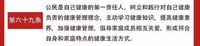 值得一提的是“倡導(dǎo)健康生活方式、倡導(dǎo)健康飲食習(xí)慣、加強(qiáng)健康管理……”等內(nèi)容被寫入法律?!督】捣ā返诹艞l:公民是自己健康的第一責(zé)任人,樹立和踐行對自己健康負(fù)責(zé)的健康管理理念,主動(dòng)學(xué)習(xí)健康知識(shí),提高健康素養(yǎng),加強(qiáng)健康管理。倡導(dǎo)家庭成員相互關(guān)愛,形成符合自身和家庭特點(diǎn)的健康生活方式。