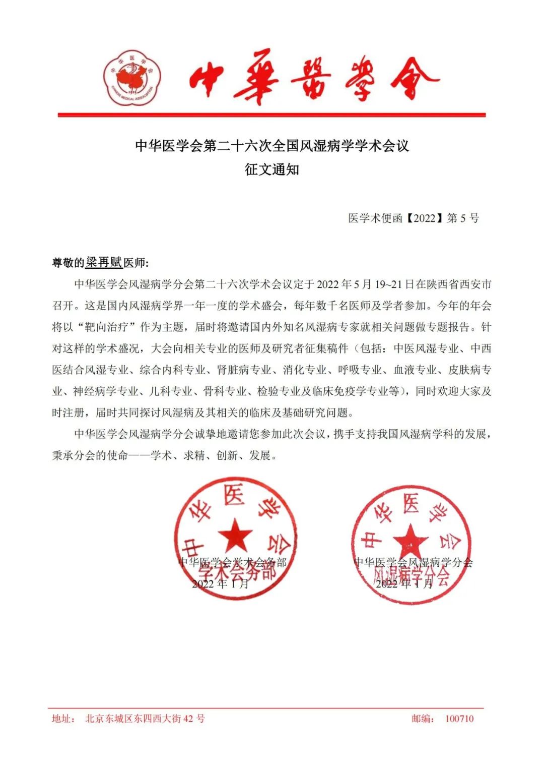 沈陽(yáng)抗風(fēng)竤(綠色)醫(yī)療產(chǎn)業(yè)管理集團(tuán)下屬沈陽(yáng)抗風(fēng)竤痛風(fēng)研究院科研團(tuán)隊(duì)收到中華醫(yī)學(xué)會(huì)“第二十六次全國(guó)風(fēng)濕病學(xué)學(xué)術(shù)會(huì)議”會(huì)務(wù)組邀請(qǐng),將于2022年5月19至21日赴陜西省西安市參加本次國(guó)內(nèi)風(fēng)濕病學(xué)界的學(xué)術(shù)盛會(huì)。